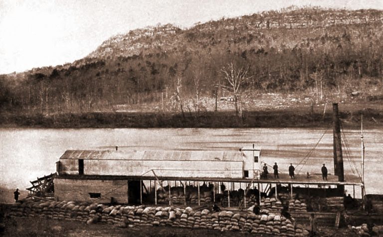 Lieutenant Gothard, with a mounted guard, marched seven of the young ladies afoot from Thomison’s five miles to Smith’s Crossroads, where six more of the girls were added, making thirteen They were then marched to Bell’s Landing on the Tennessee River. It was dark and muddy, and the girls marched before a mounted guard through water and mud in the dark, often in mud over their shoe tops. When near Bell’s Landing the squad of three from Dunwoody’s joined them, and the sixteen were marched to Bell’s Landing and held on the river bank until the old boat known as the “Chicken Thief” came. They were then ordered on board this boat, which was used by the government for shipping hay, hogs, and cattle, and what else could be found or taken from anyone who was fortunate enough to have anything left. The old boat had no cabin, but there was a place called the “dining room,” and from this the table was moved out and the sixteen girls placed therein, with a guard at each door.
